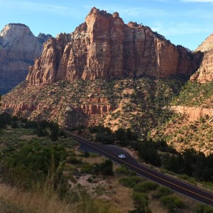 Heutiges Ziel: Virgin River Narrows Walk im Zion Nationalpark. Was wir nicht wussten: Ernie kann uns nicht hinfahren. Also rauf auf den bereits überfüllten Overflow-Parkplatz, letzte Parklücke ergattern und rein in den kostenfreien Busshuttle. Die Fahrt führt uns durch eine schluchtenreiche Landschaft und zahlreichen Canyons.